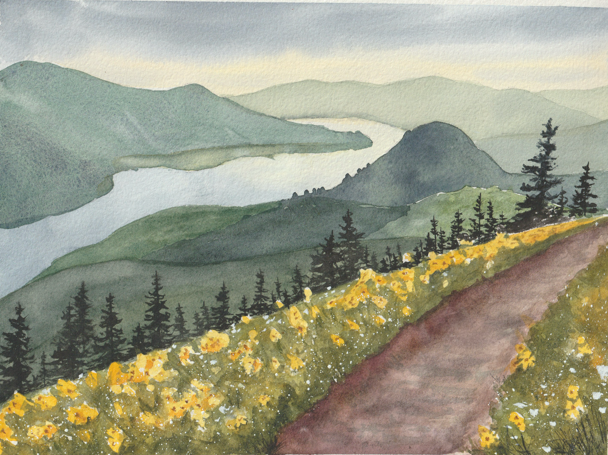 This is an original watercolor 8"x10" painting of The Gorge during Wildflower Season.
